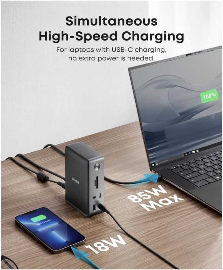 The Anker docking station is a strong mid-range option with 13 ports, including Thunderbolt, HDMI, SD card slots, Ethernet, and USB ports. It supports dual 4K displays at 60Hz and delivers 85W charging.