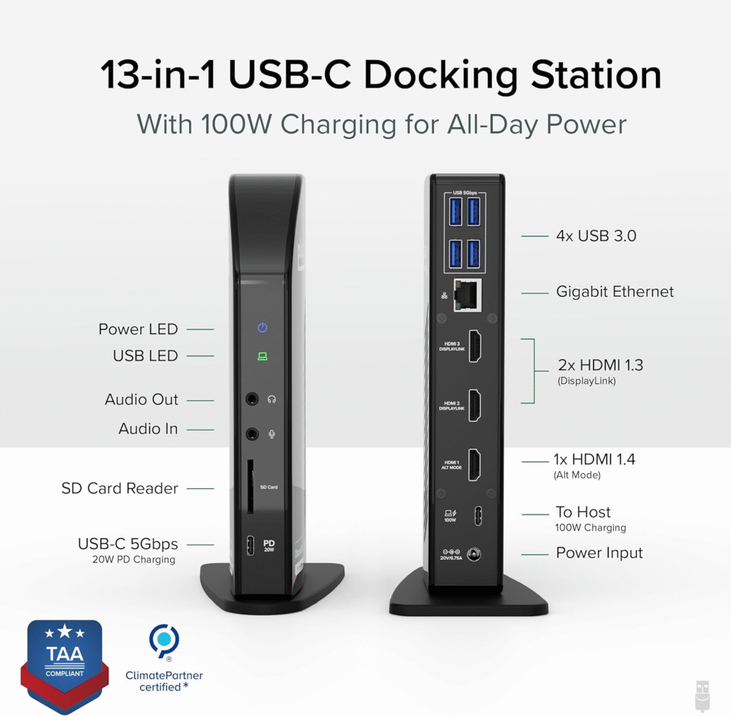 Plugable USB-C Triple Monitor docking station is designed for those who need three displays. It supports HDMI and DisplayPort connections, comes with USB 3.0 ports, Ethernet, and audio. It’s a great fit for multitaskers who need maximum screen space.